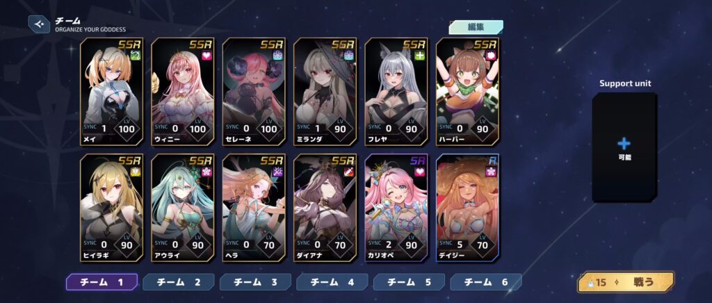 純粋なヒーラーは各レアリティ毎に1体ずつの計3キャラしかいないのでSRカリオペと、コスト回復役としてRのデイジーを編成しています。