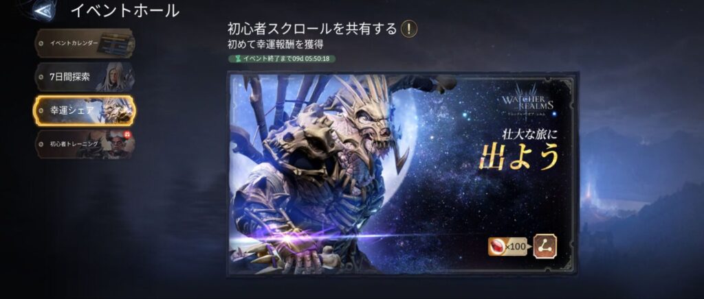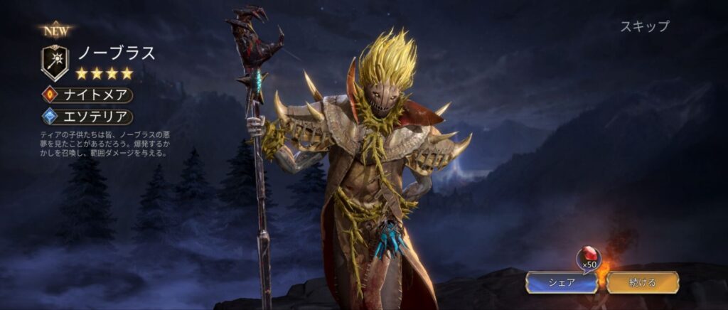 最初のガチャは確定でノーブラスです。星4以上のキャラを引くと1日1回シェアでダイヤ50個入手できます。