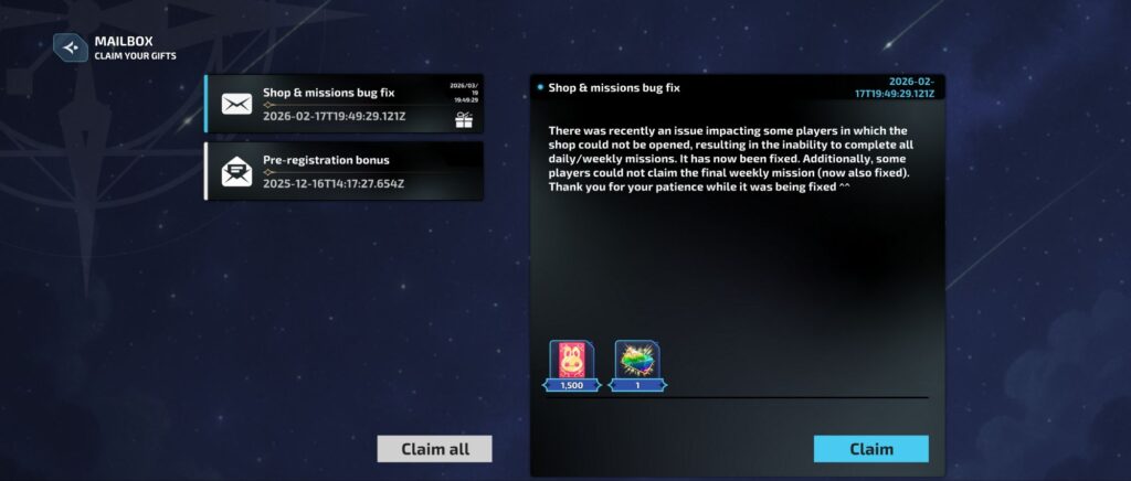 ログインしてみるとメールボックスに上のメールが届いてました。ショップやミッションがバグって正常に機能しなかったようですね。まだ表示がバグってる気がしますが今更ですし気にしません。